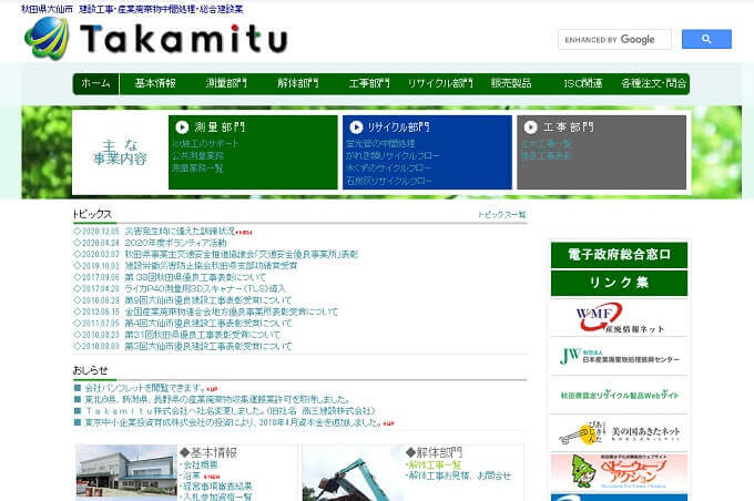 Takamitu株式会社さんは解体工事業、土木工事業、測量業、リサイクル業など、幅広く事業を展開されています。「中間処理場」と呼ばれる廃棄物をリサイクルするための施設を3種も保有されていることや、環境に配慮した施工品質を認証する「ISO認証」を取得されていることから、リサイクル業にとくに注力されている様子が伺えます。