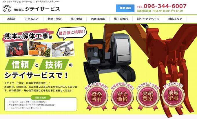 熊本市中央区北千反畑町にある有限会社シテイサービス(していさーびす)さんは、解体費用熊本最安値に挑戦されている解体業者です。家屋はもちろん鉄筋コンクリート造の大規模な建物まで、建物の大小に関わらず数多くの解体工事を行っています。なお、解体費用に関するご相談やお見積り、現地調査などは、無料で対応してくださいます。