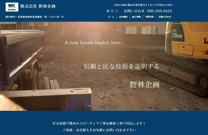 熊本市東区新生にある株式会社野林企画(のばやしきかく)さんは、スピーディーで丁寧な対応に定評のある解体業者です。建物を丸々解体する場合はもちろん「内部解体」「基礎解体」「部分解体」といった特殊な工事においても、合理的で的確な段取りを組んで対応してくださいます。