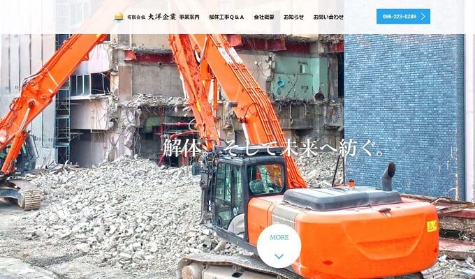 熊本市西区花園にある大政建設株式会社(たいせいけんせつ)さんは、解体工事業のみならず、土木工事業や水道施設工事業といった建設に関する一貫の業務を行っている会社です。
