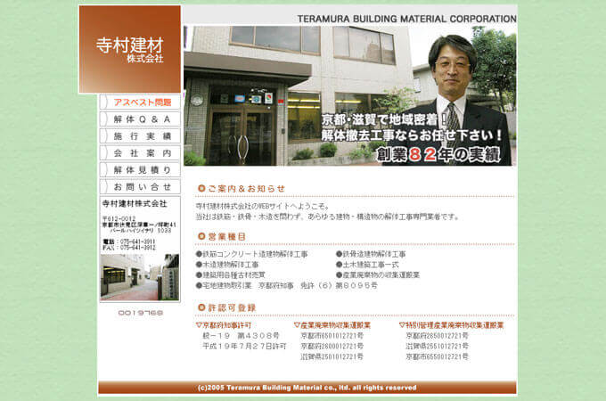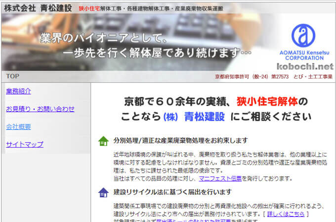 | その他 | 一般建設業許可:京都府知事許可(般・1/般・28) 産業廃棄物収集運搬業(京都、大阪、滋賀) |