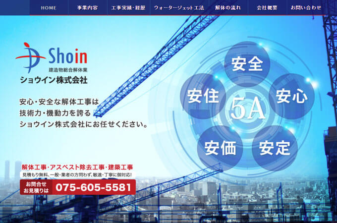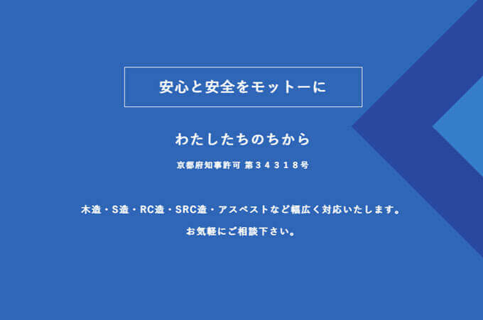 伏見区を拠点に30年以上、京都府内の解体工事や土木工事を手掛けている業者さんです。過去には、自治体から工事の品質を表彰された実績があり、豊富な経験と確かな技術力で京都の街づくりを支えている業者さんです。「初めての解体工事でどの業者に依頼すれば良いか分からない」という方も、長年に渡って地域の街づくりに貢献している、信頼できる業者さんなら安心して工事を任せられますね。