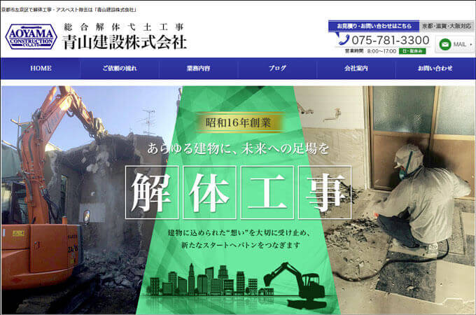 京都市から優良業者の認定を受けている解体工事の専門業者さんです。加えて、環境への取り組みが評価される国際規格の認証も取得されており、会社の透明性の高さが裏付けられているのがポイントです。また、近隣の方にはヘルメットを脱いで挨拶をしたり、周辺の清掃を徹底したりと近隣への配慮も欠かさず行なっているのも安心です。工事の品質はもちろんですが、トラブルなくスムーズに解体工事を済ませたい、という方はぜひ問い合わせてみてください。
