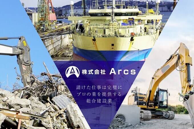株式会社Arcsさんは解体、土木、足場、板金、船舶造修など、さまざまな工事を手掛ける総合建設会社です。各分野の専門技術は他分野でも活かすことができるため、多様な作業を効率よく進められることがArcsさんの強みといえるでしょう。