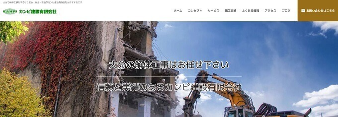 カンピ建設有限会社さんは、大分県東部・北部を中心に解体工事を請け負う会社さんです。地元密着型で長きにわたって活躍されており、現在では県や市から道路工事、河川工事、砂防工事、海岸工事などの公共工事も依頼されるなど、地元からの信頼も厚い会社さんです。