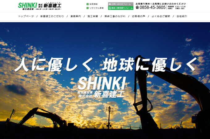 株式会社新喜建工さんは鳥取・島根・岡山で解体工事、土木工事、外構工事、仮設工事を手掛ける総合建設業者さんです。解体工事は木造・鉄骨造・RC造・SRC造・住宅・店舗・ビルなど、あらゆる構造の建物解体の実績が多数あります。