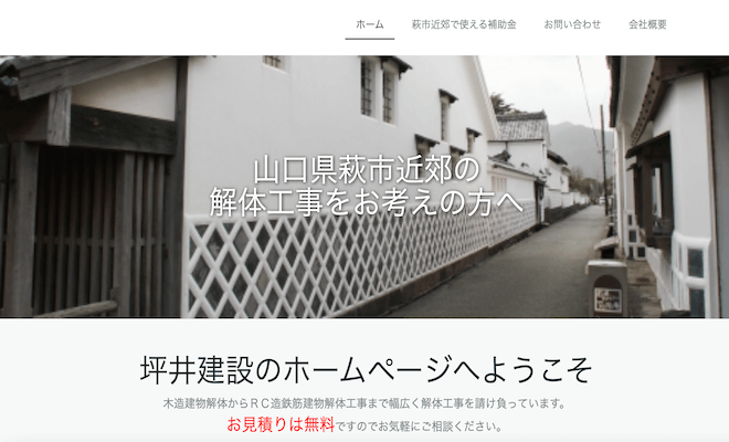有限会社坪井建設さんは、自社のホームページに「萩市近郊で使える補助金制度」というページを設けてくださっています。補助金制度とは、空き家の解体を促進するために国が解体費用の一部を負担してくれる制度です。補助金を受け取るための要件や金額については各自治体ごとに異なりますので、補助金制度を利用するためにはご自身で詳細を調べる必要があります。しかし、解体工事を依頼するほとんどの方がこの補助金制度の存在すら知らずに、補助金を受け取ることなく解体工事を終えてしまうケースが後を絶えません。